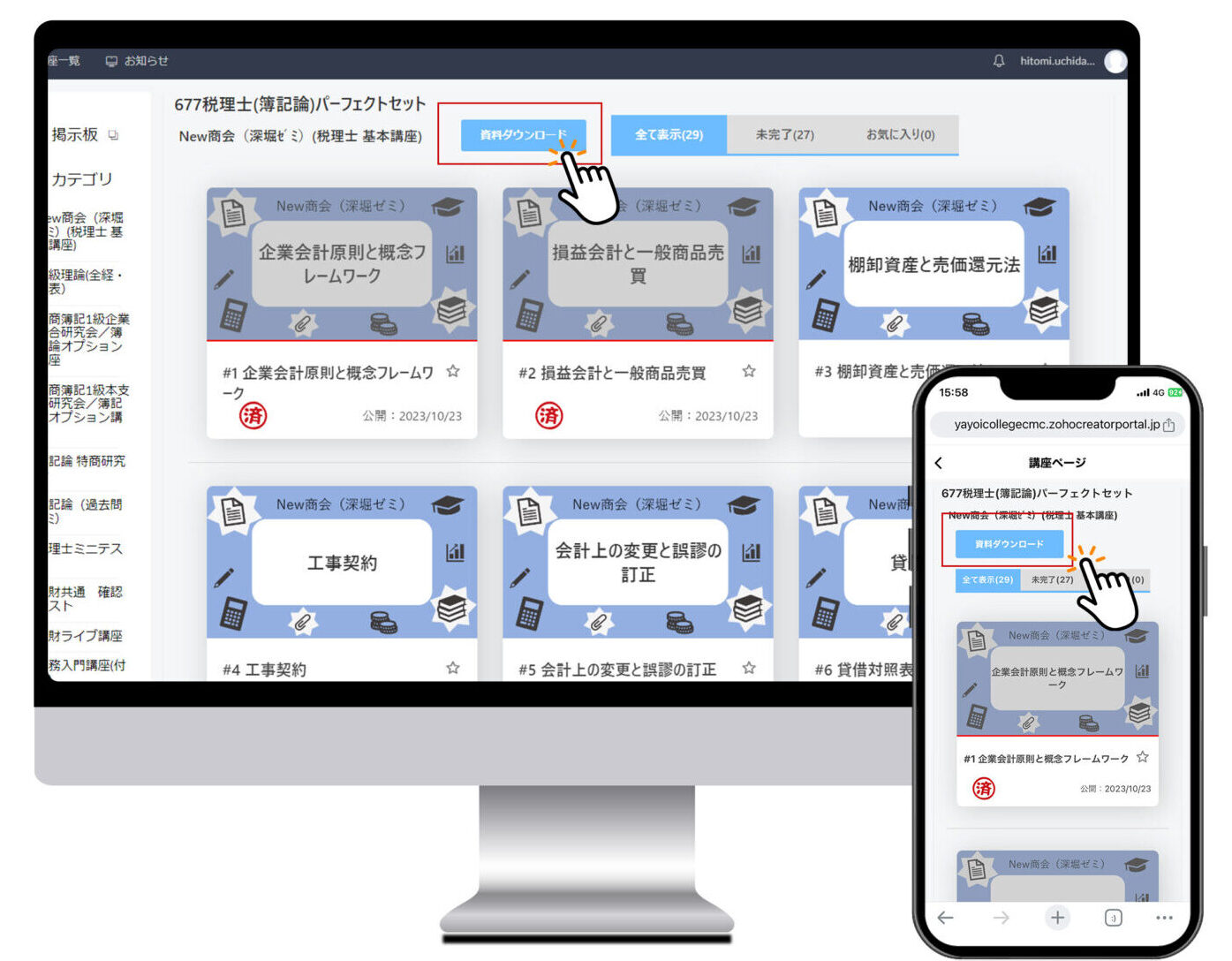 基礎講座、過去問ゼミ、理論、模擬試験等、各カテゴリーごとにダウンロードが必要です。