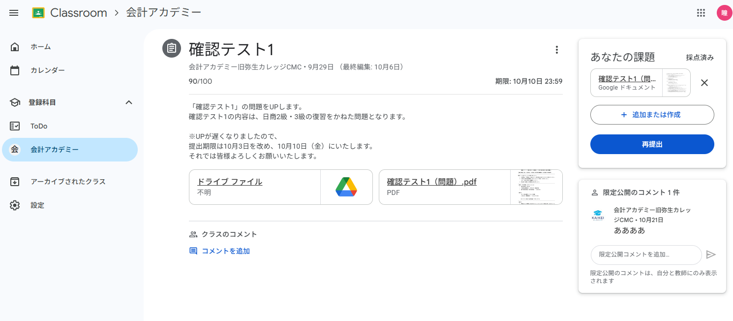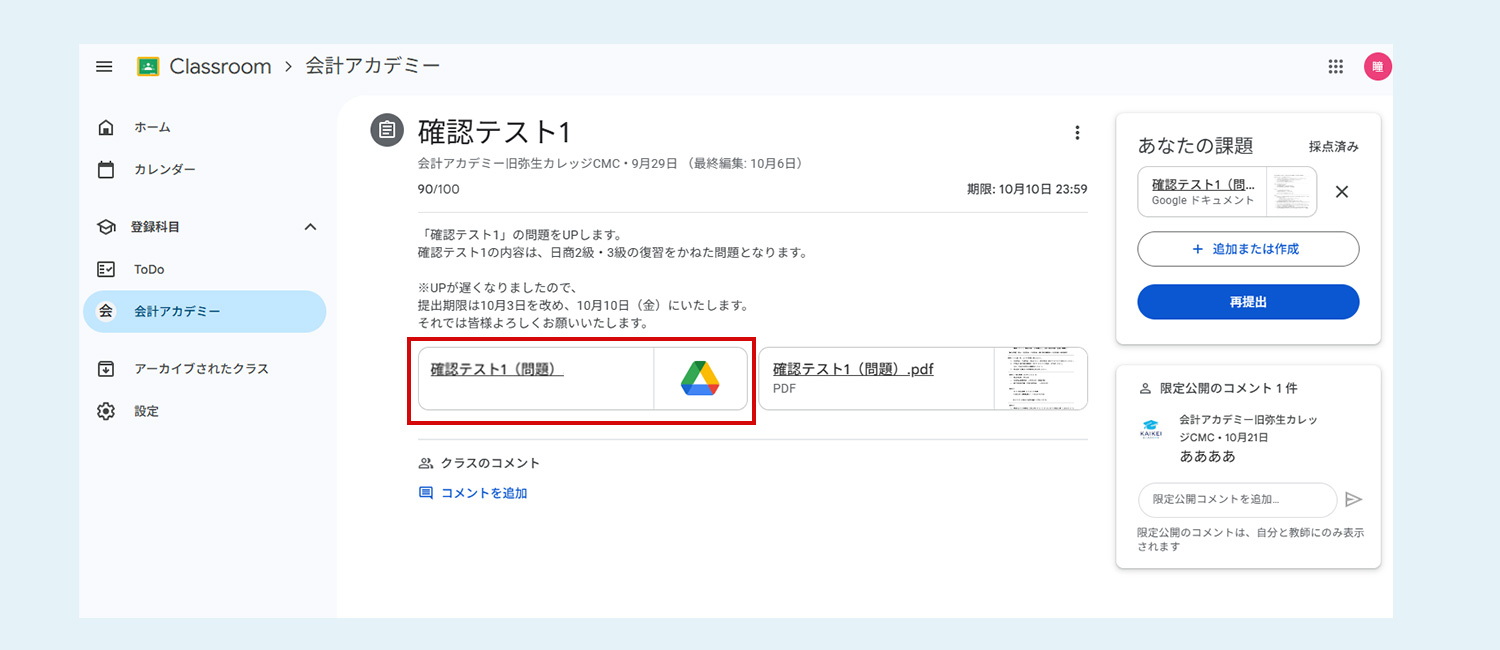 万が一、Googleクラスルームでの課題を提出がわからなかった方は、