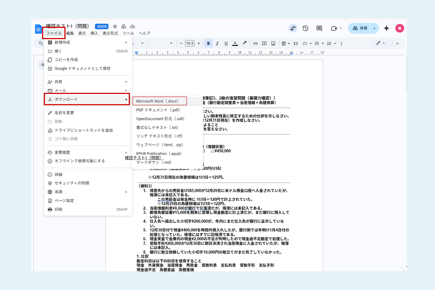 その後【ファイル】➡【ダウンロード】➡【Microsoft Word(.docx)】